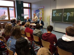 Im Rahmen des EU-Schulprojekttages Mit 45 Schülerinnen und Schülern der Klassestufe 9 diskutierte die SPD-Bundestagsabgeordnete und die beiden Kommunalvertreter über Europa, seine Chancen und Probleme.