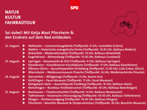 Wie jedes Jahr hat Katja Mast, SPD-Bundestagsabgeordnete für die Menschen aus Pforzheim und den Enzkreis, die parlamentarische Sommerpause des Deutschen Bundestags genutzt, um mit den Bürgerinnen und Bürgern vor Ort Pforzheim und den Enzkreis zu erkunden. Unter dem Titel „Natur-Kultur-Fahrradtour: Pforzheim und den Enzkreis auf dem Rad entdecken“ ging es in diesem Jahr in sieben Tagen über 300 km durch 27 Stationen in Pforzheim und dem Enzkreis.