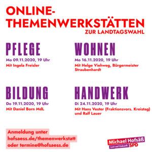 Wir möchten Sie und Euch herzlich einladen zu den ersten vier Online-Themenwerkstätten zur Landtagswahl! Unser Landtagskandidat im Enzkreis, Michael Hofsäß, will auf diesem Weg Ihre Anregungen und Erfahrungen zu den Themen Pflege, Wohnen, Bildung und Handwerk hören.